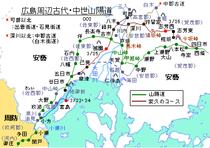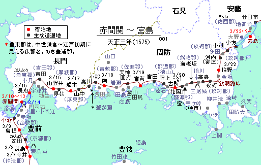 ・3/18 「一 十八日、巳刻(10時頃)打立て、未刻(14時頃)に山中の町(長門厚狭郡)を打過、周防の内賀川(嘉川:周防吉敷郡)の町を通り、こゝふり(*小郡)とて町有、それゟ(より)酉の刻(18時頃)にすへ(陶:吉敷郡)の町ニ着、太郎左衛門といへるものゝ所ニ一宿、」