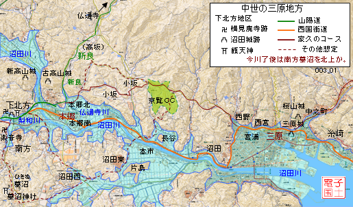 家久君は下北方(の古地)から沼田川を渡り、前日の雨で出水していた三角州の内、仏通寺川付近を褌姿で渡り、新良(しんら)の南端から小坂を北東に進み、「新良」から三原に通じる県道155号線の京覧カントリークラブの北西端付近で県道に合流し三原の北西部から三原市西野・宮野に入ったのではなかろうか。言い換えれば、アバウトではあるがこれが中世の実質的な山陽道であったかもしれない。これが、今川了俊の「道ゆきぶり」との比較検証の動機になったのではあるが...。