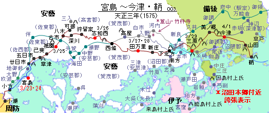 (注)本郷町南方地区の蟇沼神社や下北方地区の甑天神・沼田城(高木山城)址等の記載から当時の沼田荘(郷)の中心は、入海していた沼田南西側沿岸部の下北方・南方地区で、ここに滞在したと思われる。現在の本郷町本郷は沼田川本郷橋左岸(沼田川左岸)の氾濫原三角州一帯。三原付近から沼田の間は海行であったと思われるが文脈から確定できない。