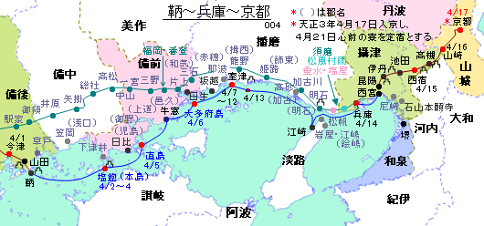 (注)2月20日に京を出発してから、次に月日が記入されるのは5月19日に尾道から沼田(本郷)に移動した所で、その間の各地滞在期間は不明。備中屋影(矢掛)までの宿泊地は(・着きぬ・到りぬ・とどまる等から想定できるもののみ)太字記載。