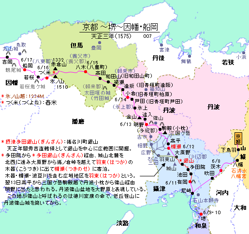 ・6/15 「一 十五日、打立、三里坂といへるを越え、但馬の内大田垣の城有、其よりやなせ(*梁瀬)(朝来郡)の市場を通、垣屋とのゝ持たかた(*高田)の町(和田山町高田)にやすらひ出行に、一日坂といへるを越、八木殿の町に着、善左衛門といへるものゝ所ニ一宿」