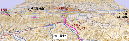 篠山盆地東南部に波多野氏の主城八上城(高城山)がある。丹波篠山付近は信長の命を受けた明智光秀が天正3年から7年にかけて攻略。丹波篠山城は関ケ原の戦いののち慶長14年(1609)徳川家康が八上城に入った松平康重に命じ盆地中心部の低丘陵「笹山」に築城し八上城を廃城(wiki引用)。(wiki)