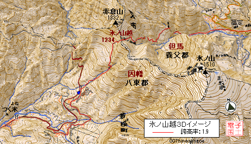 (注)氷ノ山(ヒノセン):中国地方「大山」に次ぐ高峰。北側赤倉山との間に「氷ノ山越」があり、峠を越えると因幡八東郡のうち「つく米」(舂米:つくよね)という閑集落がある。