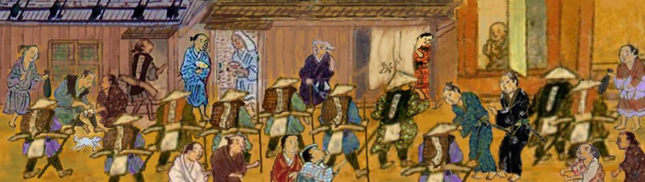 ・6/25 「一 廿五日、打立行に、肝付新介ニ行逢候、加治木衆三十人ほと同行、さて西田(邇摩郡)の町を打過湯津(温泉津・ゆのつ:邇摩郡)に着、其より小濱(温泉津の内小濱の湊)といへる宮の拝殿にやすらふところに、伊集院に居る大炊左衛門酒瓜持参、さて湯に入候へは、喜入殿(薩摩重臣)の舟に乘たる衆・秋目船の衆・東郷の舟衆・しらハ衆、各すゝを持來候、其より小濱のことくまかり、出雲之衆、男女わらハへ(童部)あつまりて能ともなし、神まひともわかぬおひいれ、出雲の歌とて舞うたひたる見物し、其より小濱(温泉津・小浜の湊)のはたこやにつき、亦湯乃津のことく歸り候へハ、船頭各ゝ我ゝ船に乘候へと申間、寔いせひを仕候、夜入候て、関東の僧とて見參有へき由候間、斟酌候へ共、薩广にて聞給しとてすゝを持せ、与風來られ候間、無了簡參會、亦亭主ゟもすゝを得させ候、亭主小四郎、」