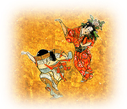 (注)「おひいれ」:おびれ・「尾鰭」か?:この解釈が正解なら、転じて派手さ、大げさゝをあらわす。能や神舞とも違う特異な派手な服装・大げさな仕草の舞の意か?まさか、わらばへが両足・両股を大きく広げ顎をシャクリ、大見得を切ったか...???